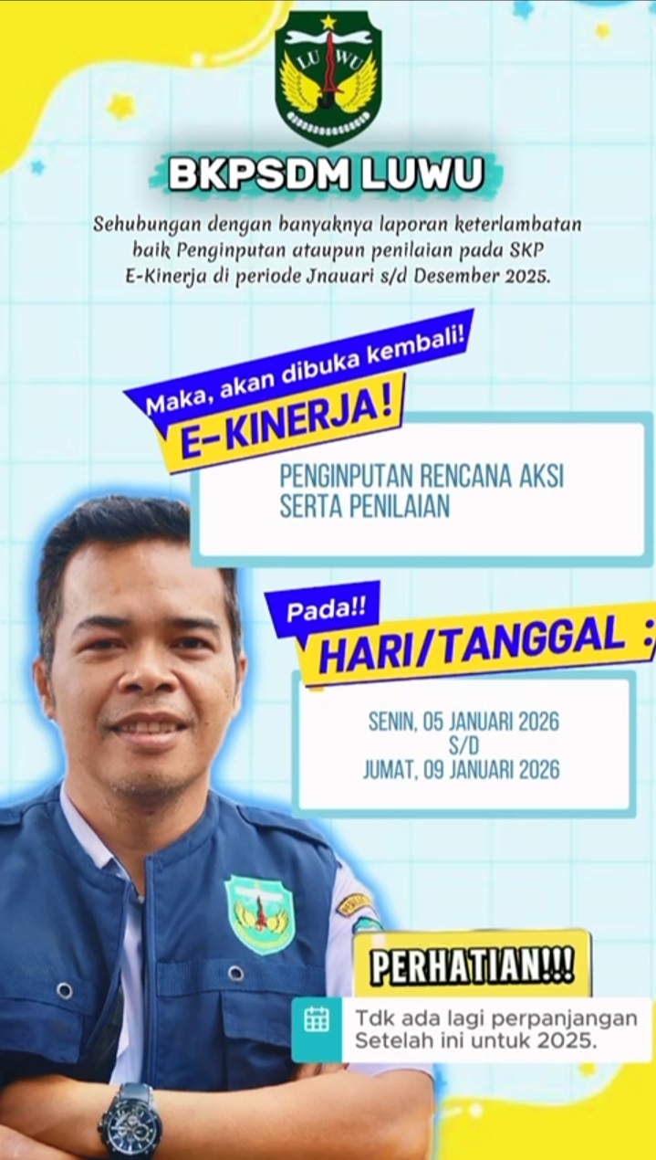 “Penginputan Rencana Aksi, Penilaian, dan SKP E-Kinerja,” kata Arsyad. “Tegaskan, tidak ada lagi perpanjangan waktu setelah 9 Januari 2026,” tambahnya.