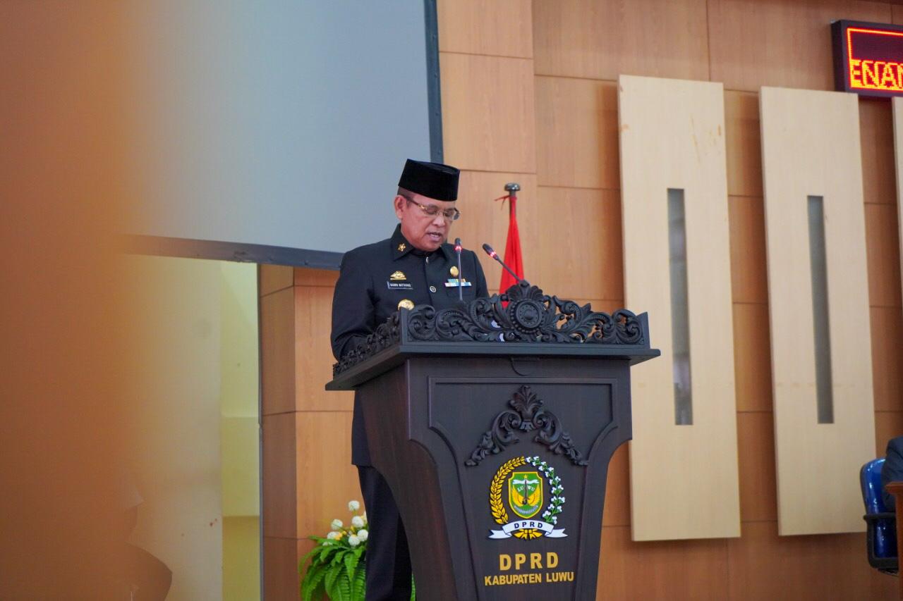 BELOPA, Aksara.News – Bupati Luwu, Dr H Basmin Mattayang, menyampaikan pendapatnya atas penyerahan Rancangan Peraturan Daerah Inisiatif DPRD Kabupaten Luwu dalam Rapat Paripurna di ruang rapat Paripurna Kantor DPRD Luwu, Kelurahan Senga Kecamatan Belopa, Rabu (21 April 2021).