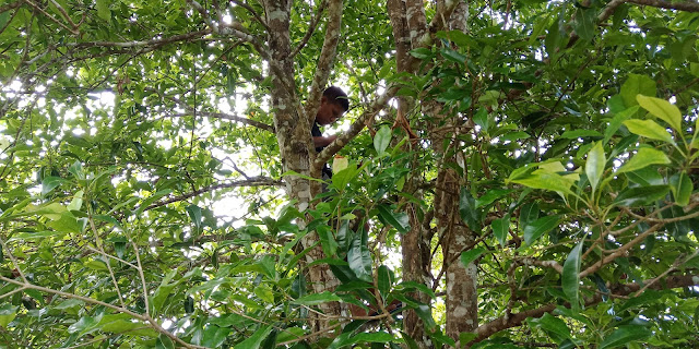 | Salah satu mahasiswa yang panjat pohon untuk mencari signal yang bagus |