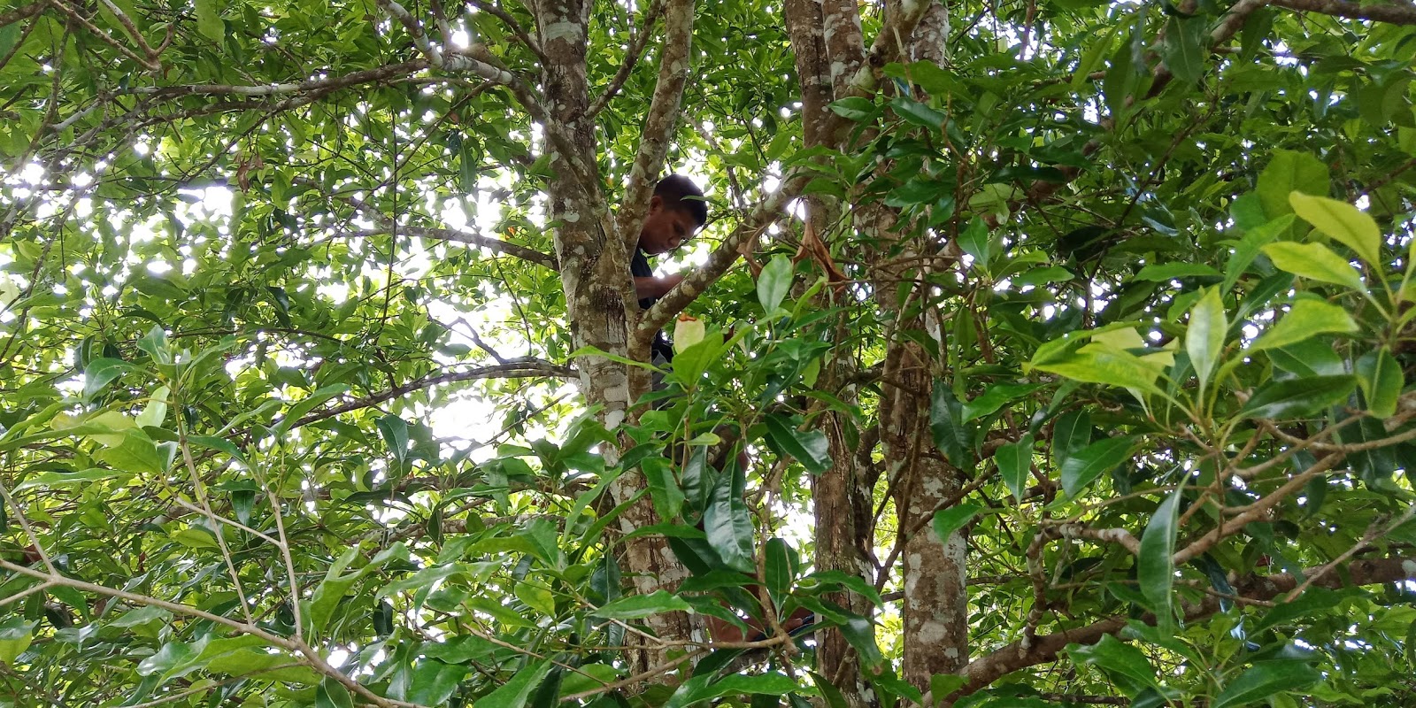 | Salah satu mahasiswa yang panjat pohon untuk mencari signal yang bagus |