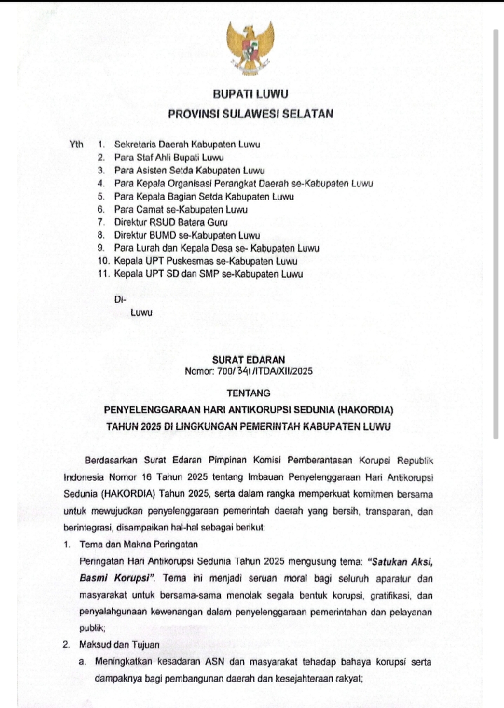 Patahudding, menekankan bahwa peringatan HAKORDIA 2025 bukan sekadar seremoni, tetapi ruang untuk memperkuat kolaborasi lintas lembaga dalam pemberantasan korupsi. Ia mengajak seluruh ASN dan masyarakat Luwu untuk terlibat aktif melakukan pengawasan terhadap jalannya pemerintahan.