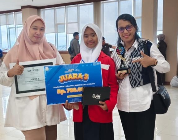 LUWU, Sulsel, Aksaranews.id – Aulia Khaerani Muslimin, siswi SMPN 1 Bajo, Kecamatan Bajo, Kabupaten Luwu, berhasil meraih juara 3 dalam lomba pidato bahasa Inggris anti korupsi se-Sulsel yang diselenggarakan dalam rangka Hari Anti Korupsi Sedunia. Acara ini diadakan di Kejati Sulsel, Senin (8/12/2025).