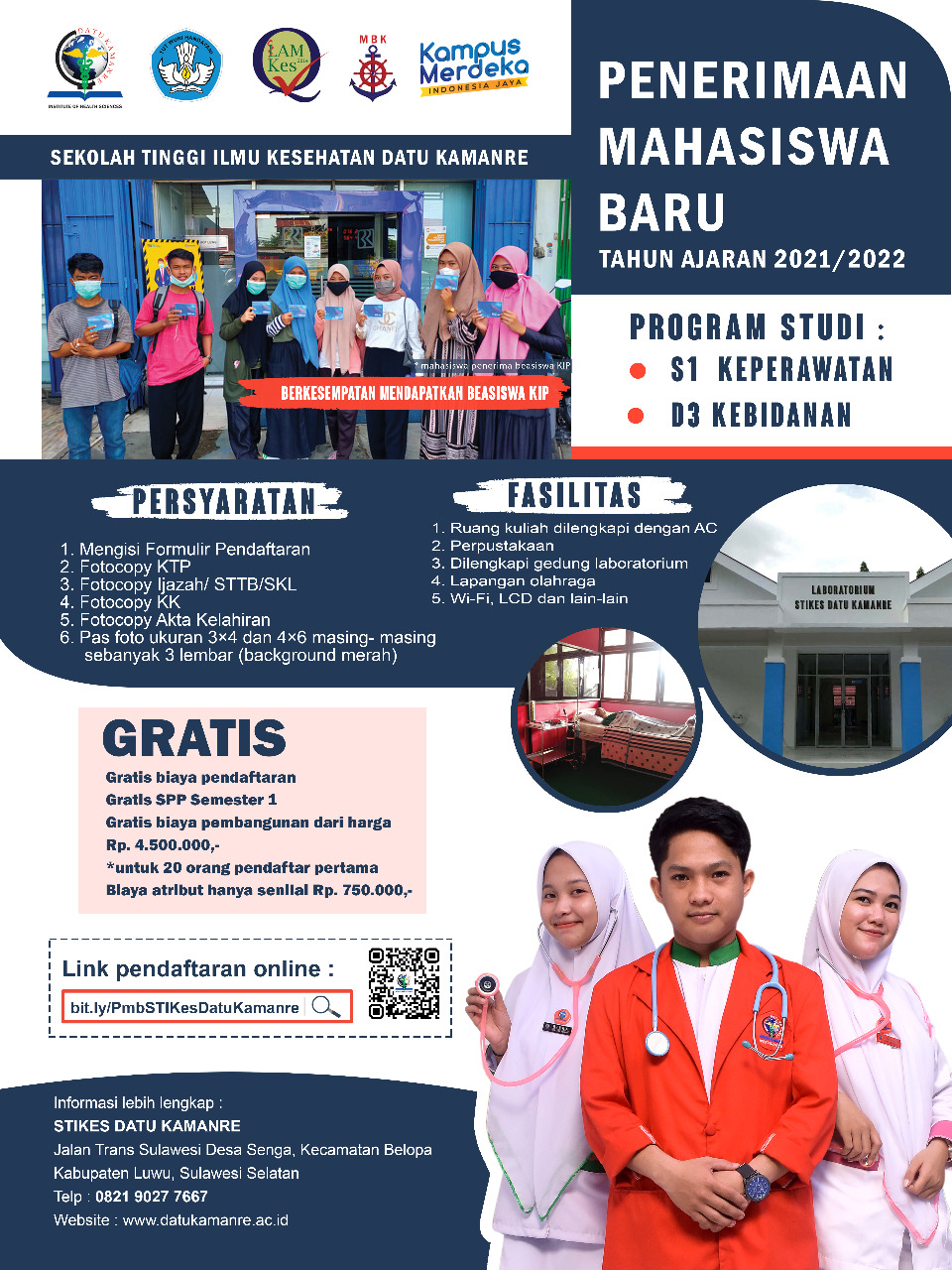 STIKES Datu Kamanre memberikan kemudahan bagi adik-adik yang ingin melanjutkan pendidikan dibidang kesehatan dengan menggratiskan biaya pendaftaran dan gratis SPP untuk Semester 1.